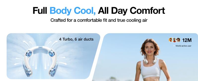2025 COOLiTE neck fan uses innovative 4-turbo wind fans design and patented airflow compression technology, delivering 8450r/min ultra-high speed and 22ft./s gale. With 6 hill-type air ducts in two directions (up and down), COOLiTE brings 360° airflow around your face, neck and back, enabling cooling of your whole body. In just 3 seconds, feel a temperature drop of up to 15°F, making it perfect for stifling offices, scorching car interiors and outdoor activities